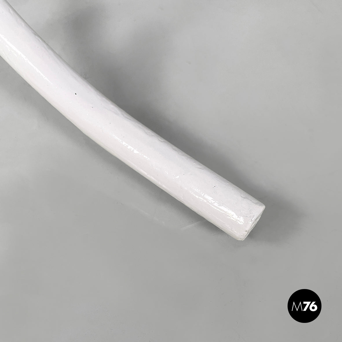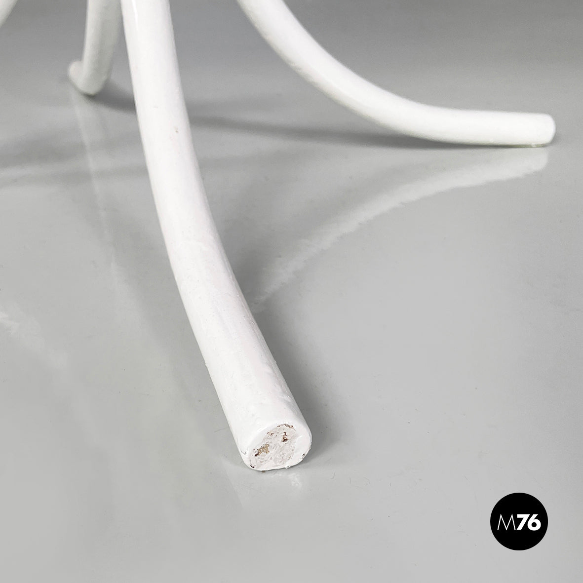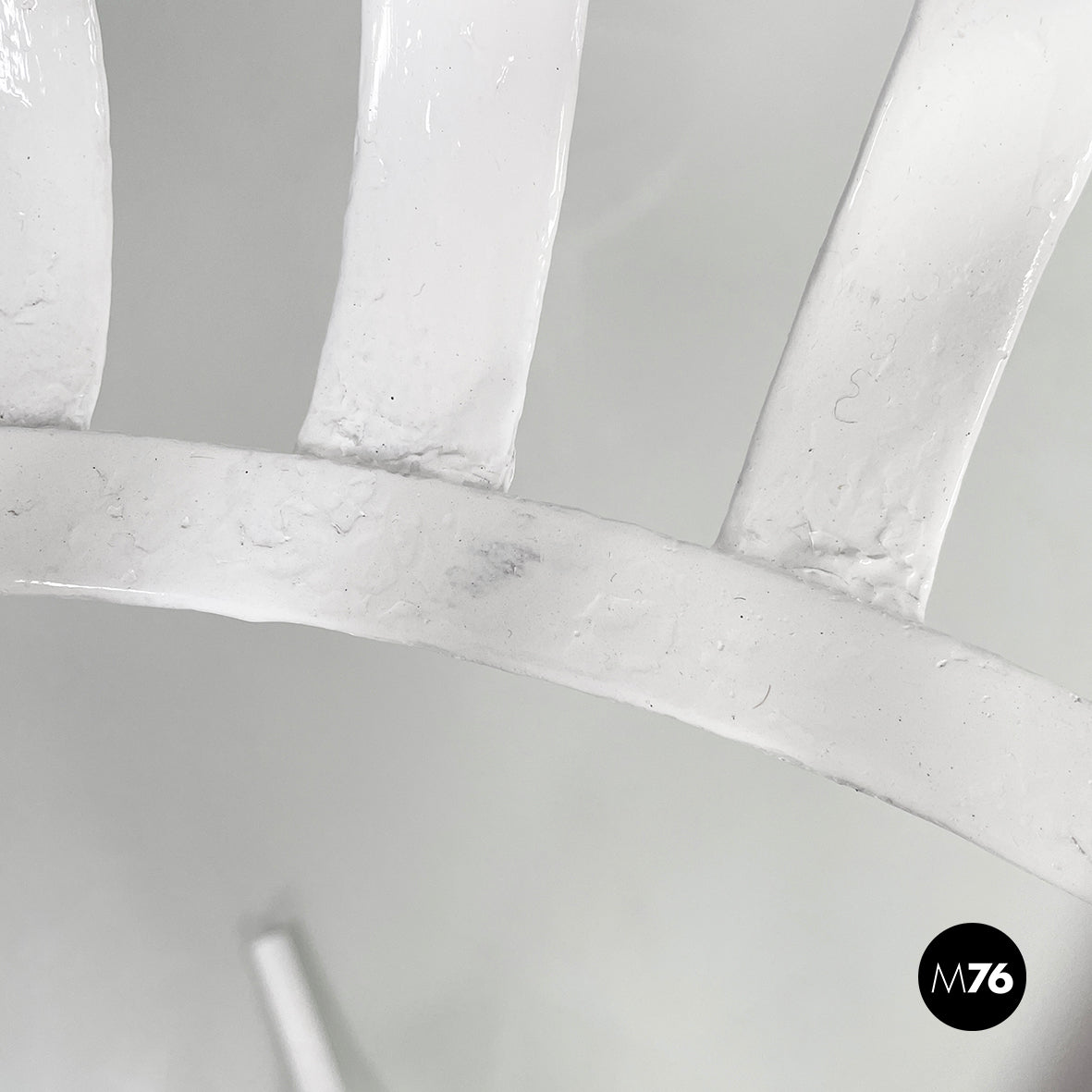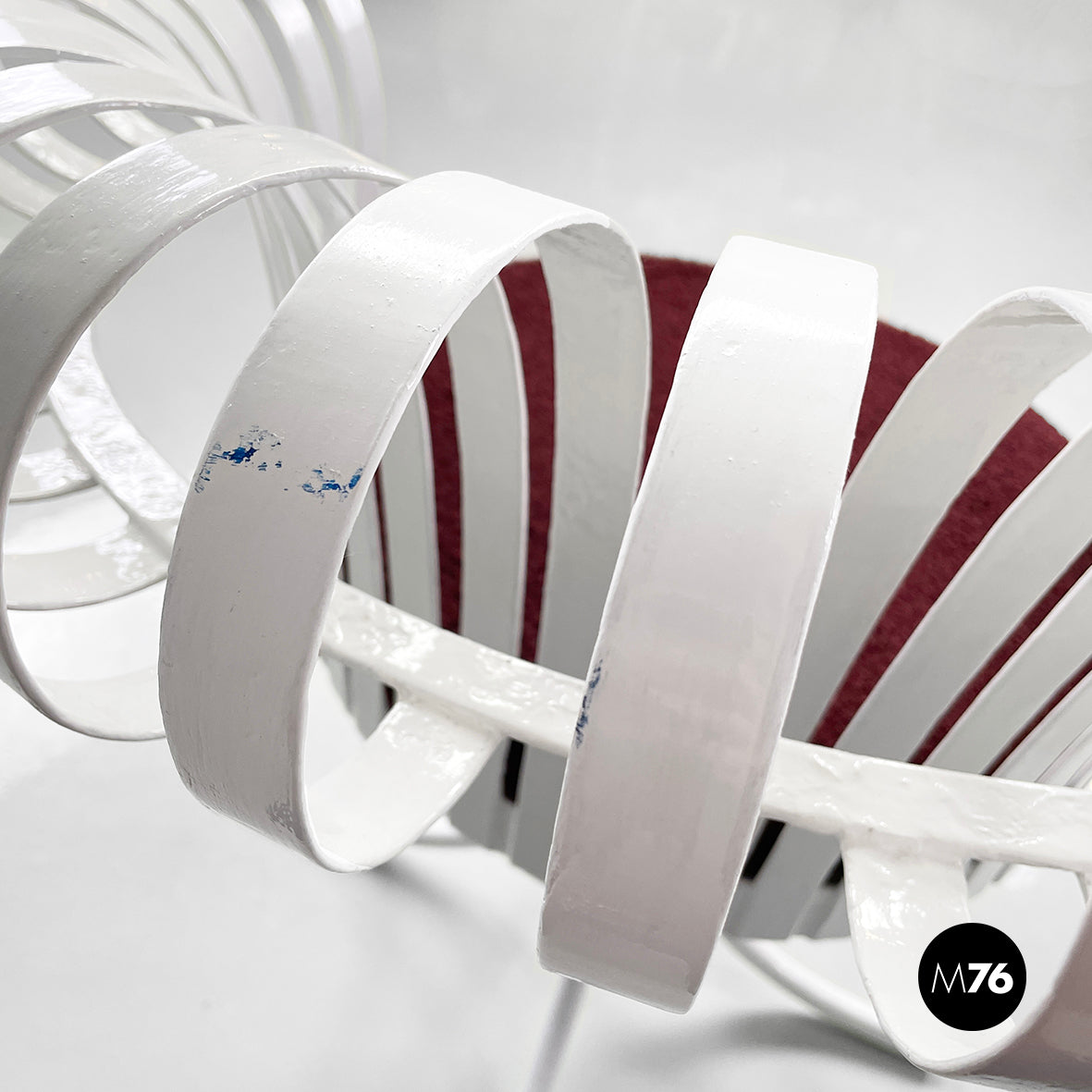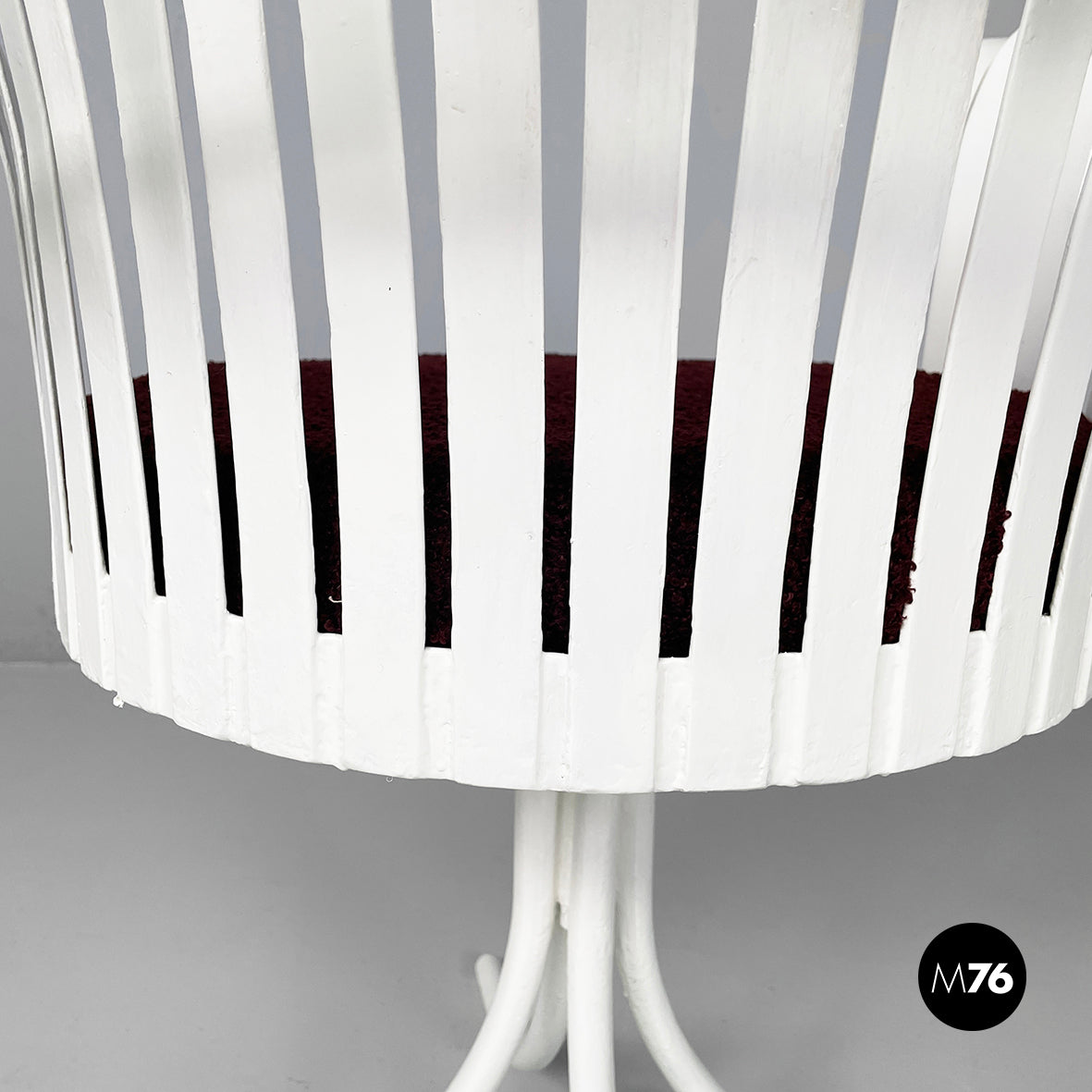 Set of four armchairs with round seat padded in brown teddy fabric, the brown tending towards red. The backrest and armrests are made of curved curly strips, in white painted metal. Four-spoke base in white painted metal rod. Suitable for outdoor use as garden chairs.