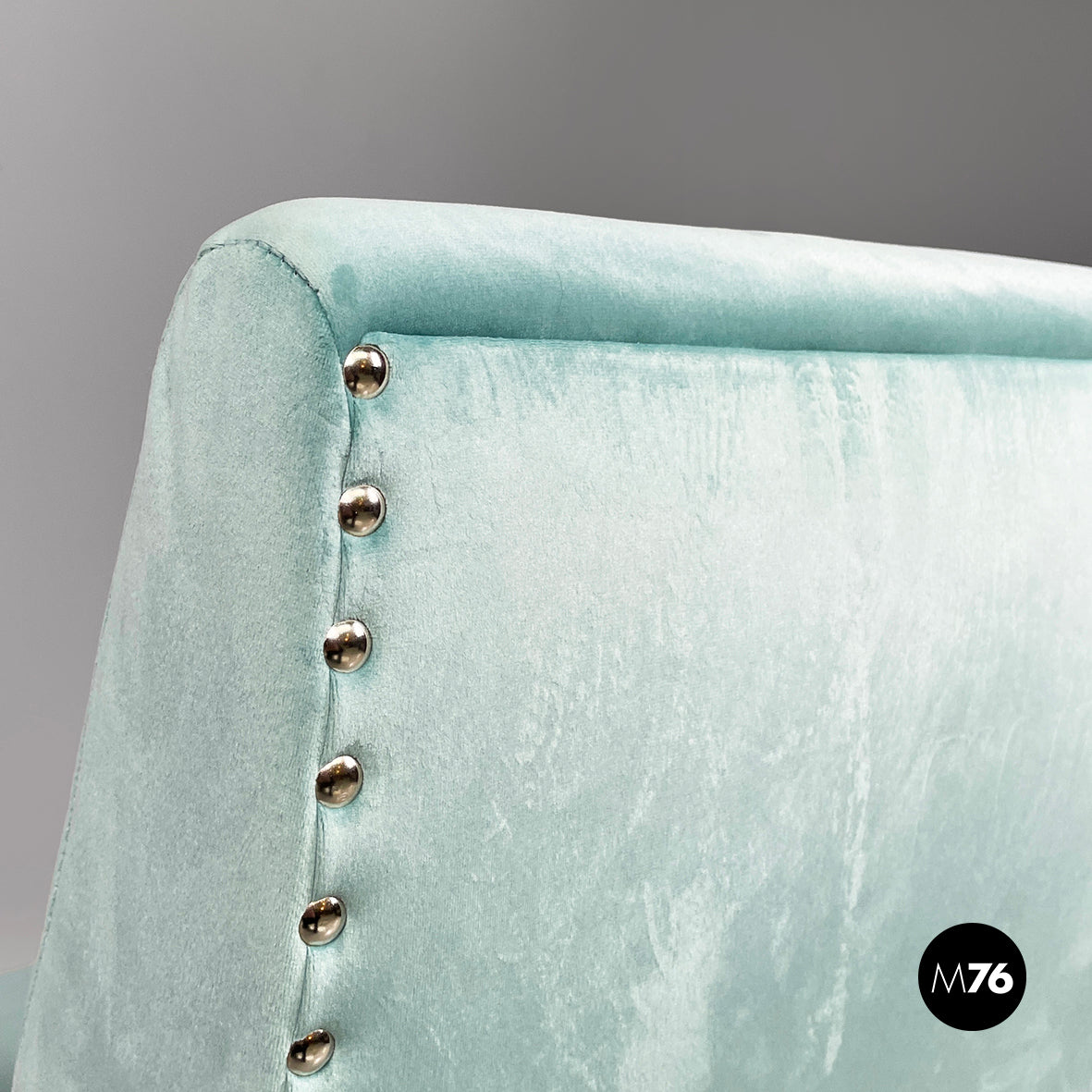 Pair of armchairs with square seat and backrest, padded and upholstered in bright blue velvet with round metal studs. The armrests are in curved wood. Square section wooden legs.