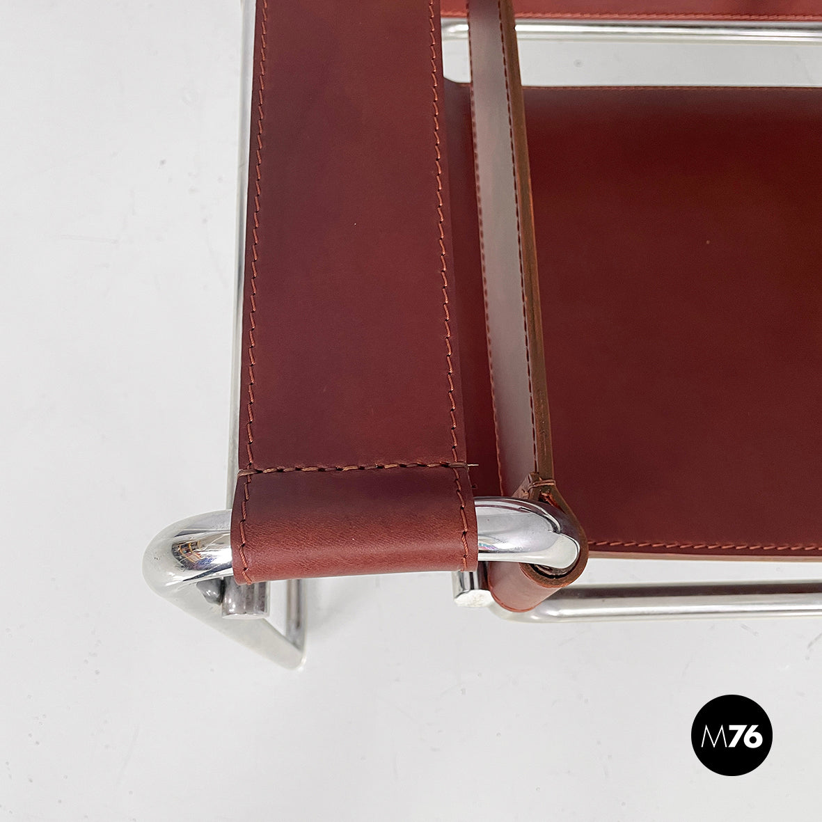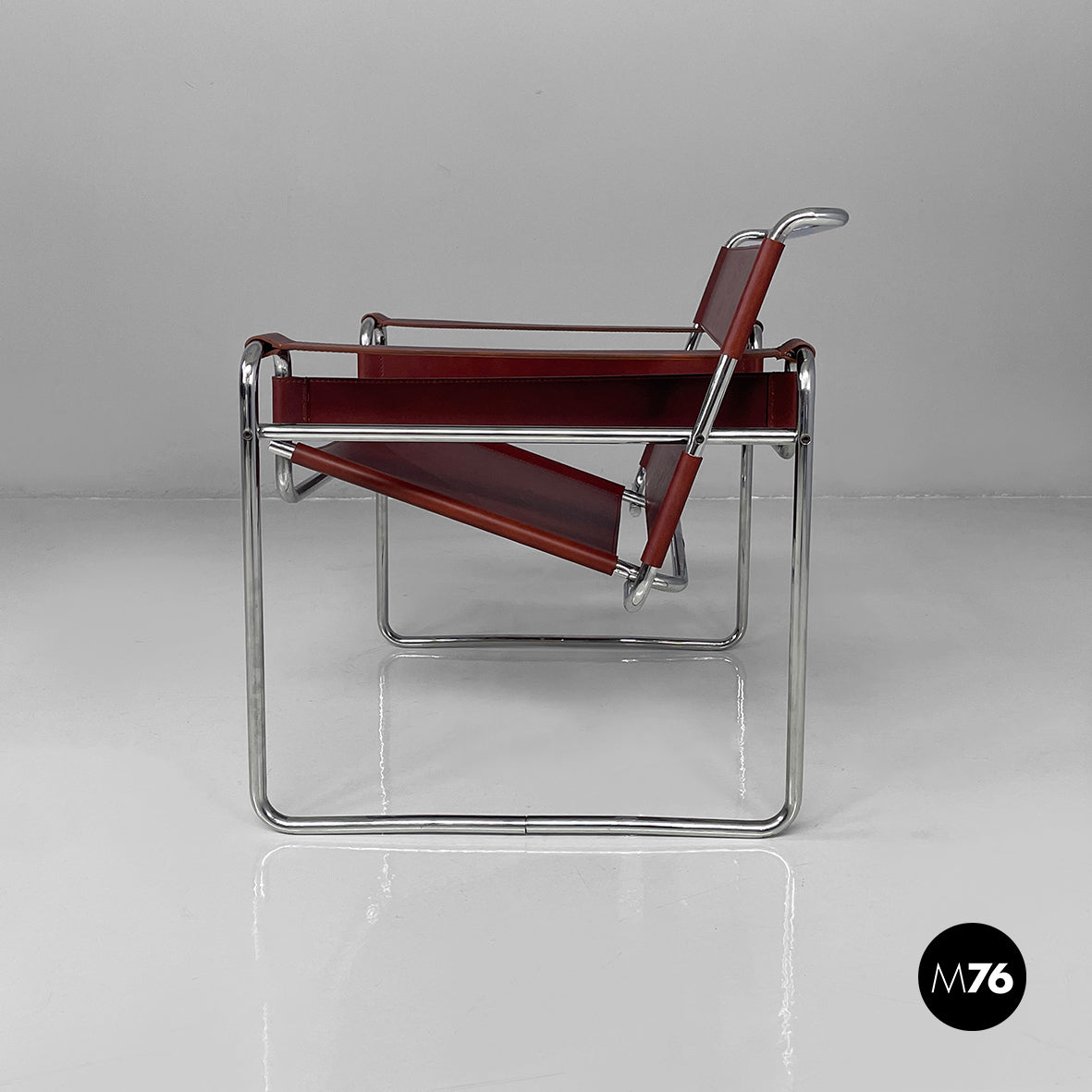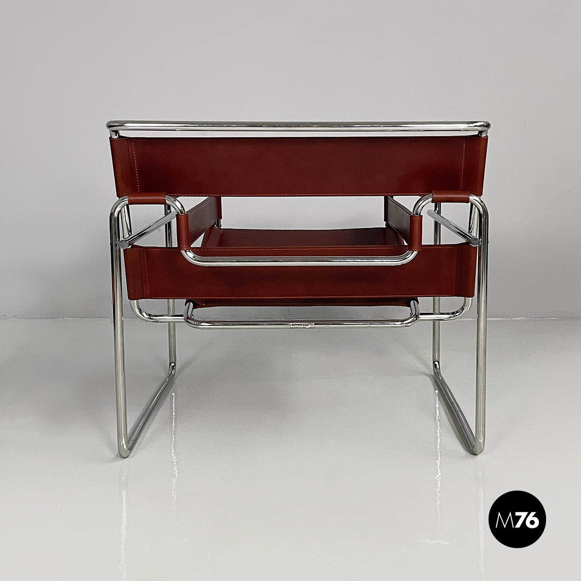 Pair of armchairs model Wassily or B3  in red-brown leather. The backrest, armrests and seat are made entirely of leather with visible stitching. The structure is made of chromed tubular steel.