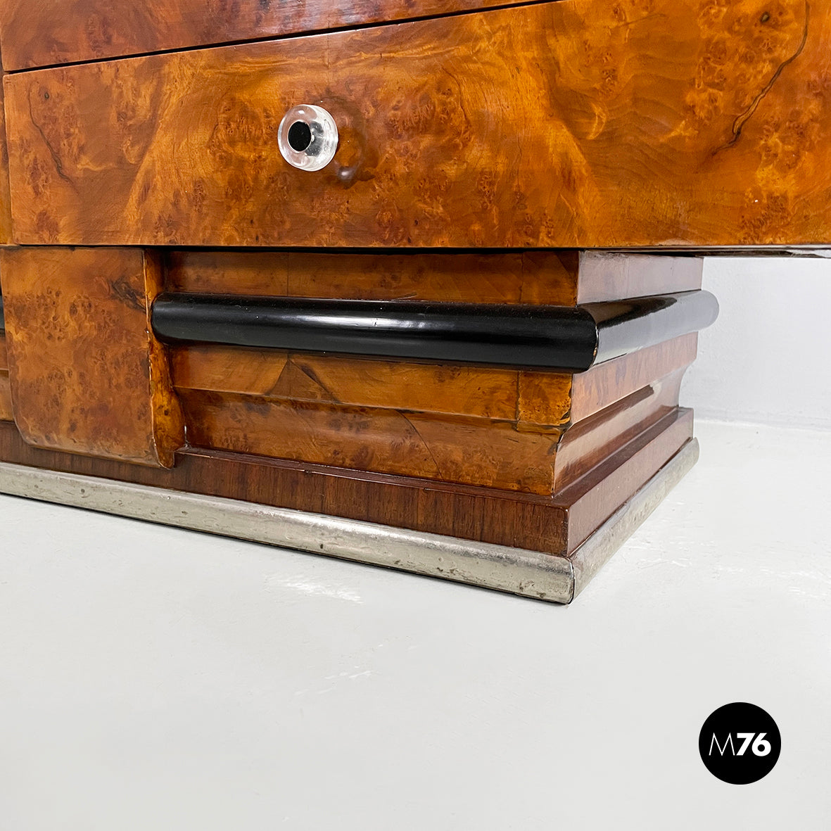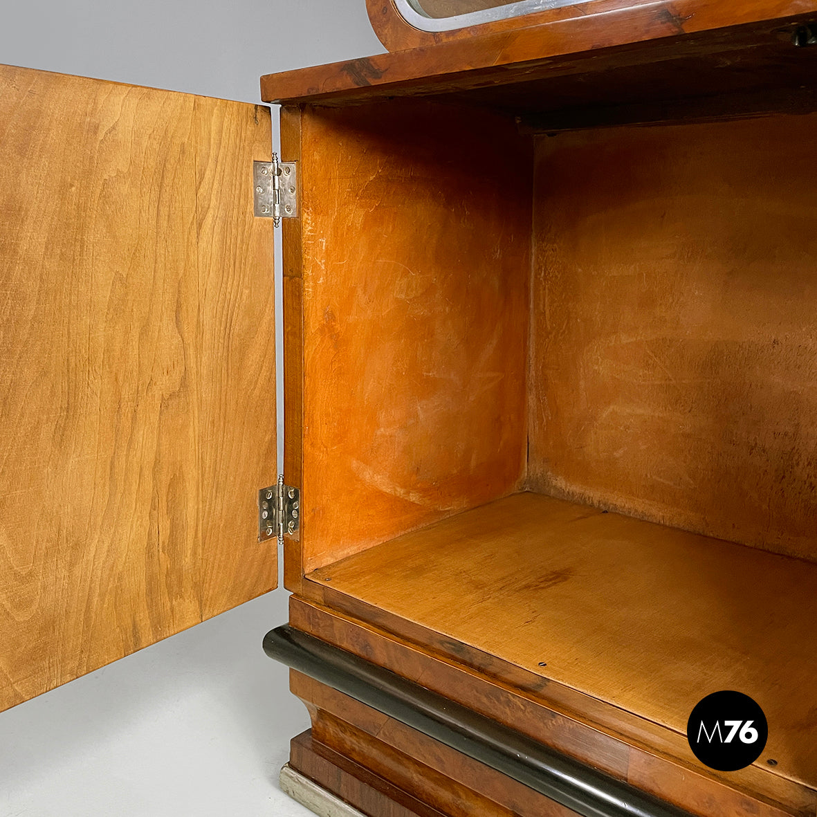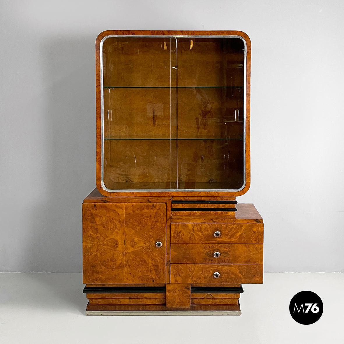 Asymmetrical highboard or sideboard with display cabinet in wood and glass. The upper rectangular compartment with rounded corners in wood has two glass sliding doors and two internal glass shelves. In the lower wooden part there is a compartment with a hinged door and three drawers. Round handles in transparent plastic. Black wooden details in relief. Rectangular base with metal detail. Art Deco.