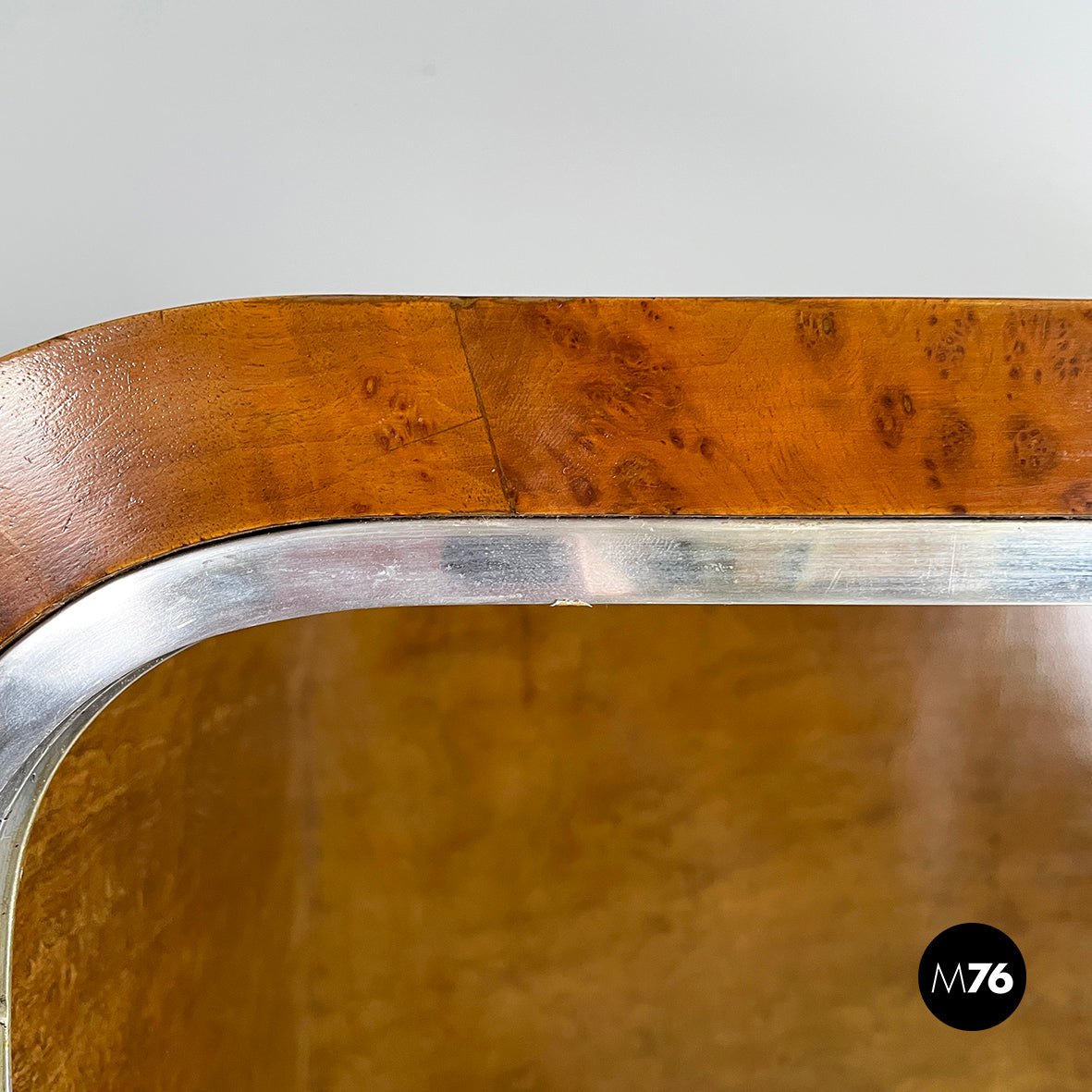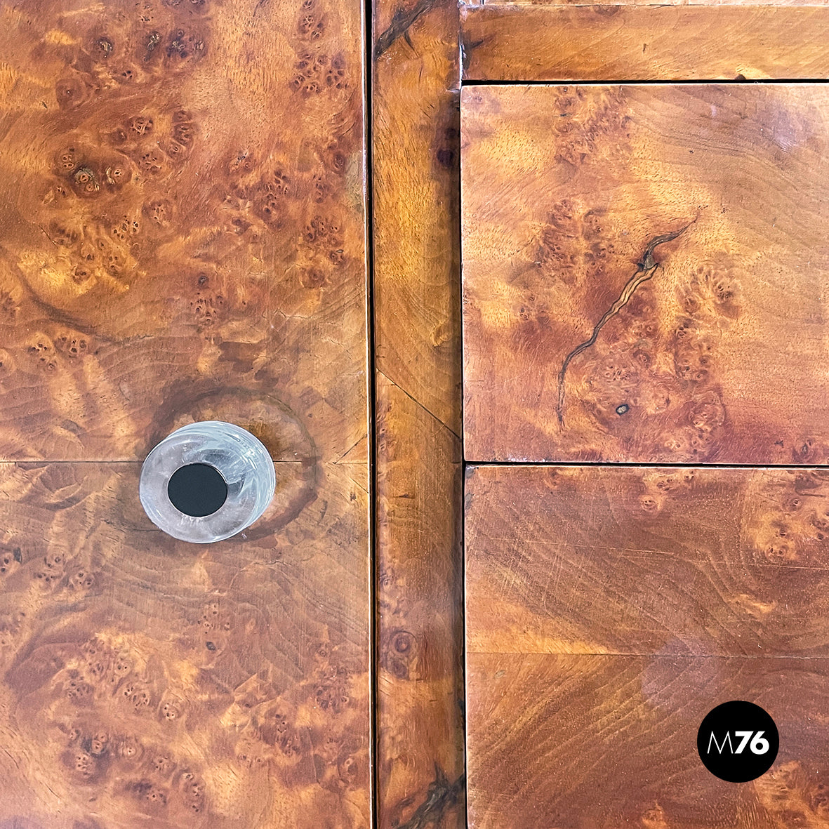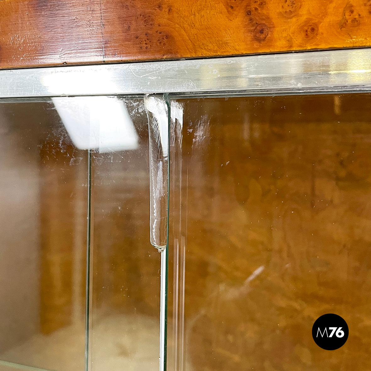 Asymmetrical highboard or sideboard with display cabinet in wood and glass. The upper rectangular compartment with rounded corners in wood has two glass sliding doors and two internal glass shelves. In the lower wooden part there is a compartment with a hinged door and three drawers. Round handles in transparent plastic. Black wooden details in relief. Rectangular base with metal detail. Art Deco.