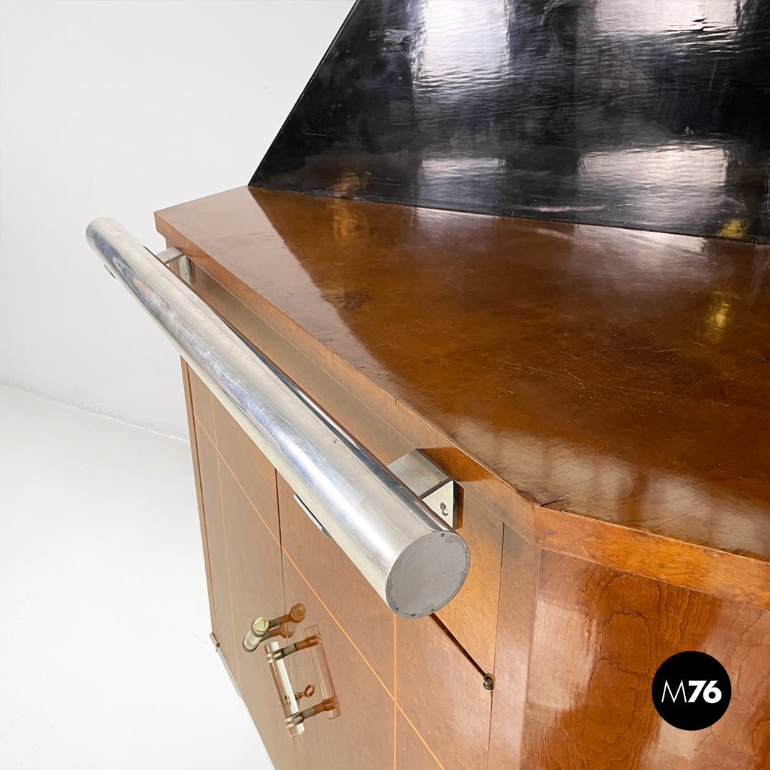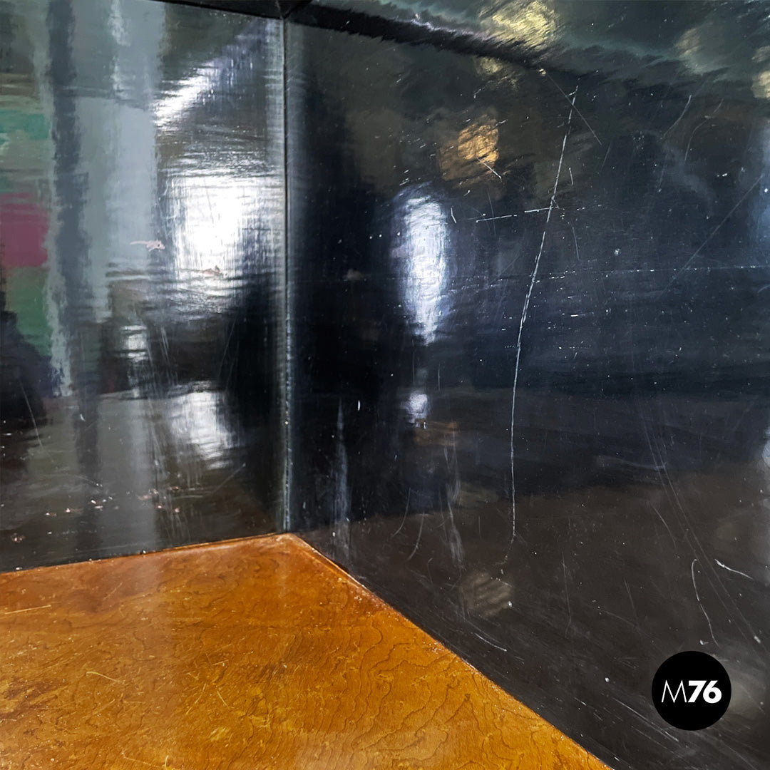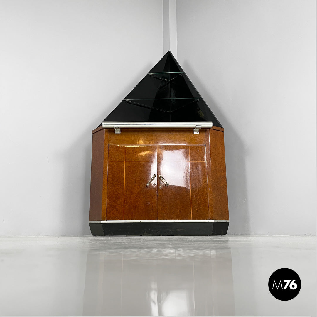 Wooden corner bar cabinet. The upper part has a triangular structure painted glossy black, with two triangular glass shelves. The lower part is made of walnut burl and includes two doors with clear glass handles and keys that open to reveal an internal compartment with a shelf in between. The lower doors feature a refined linear geometric decoration, consisting of thin inlaid strips that define rectangular frames. The base is black. There is a tubular metal handle on the front. The lower back is unfinished.