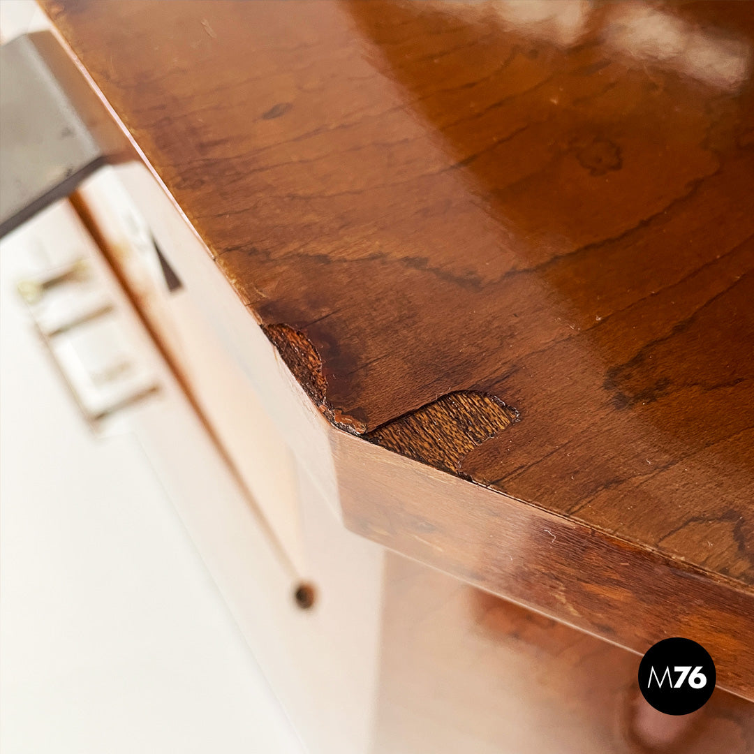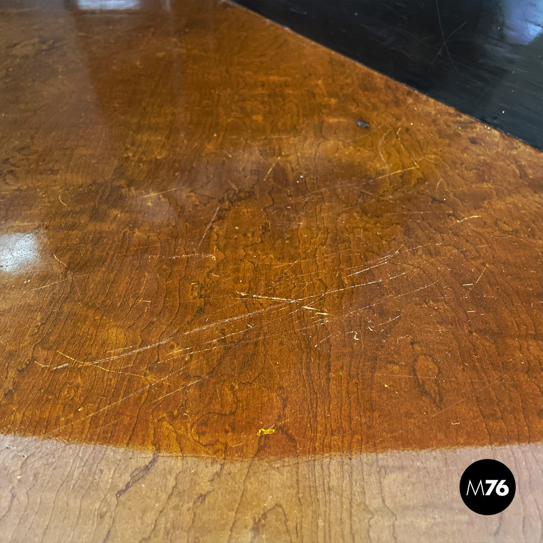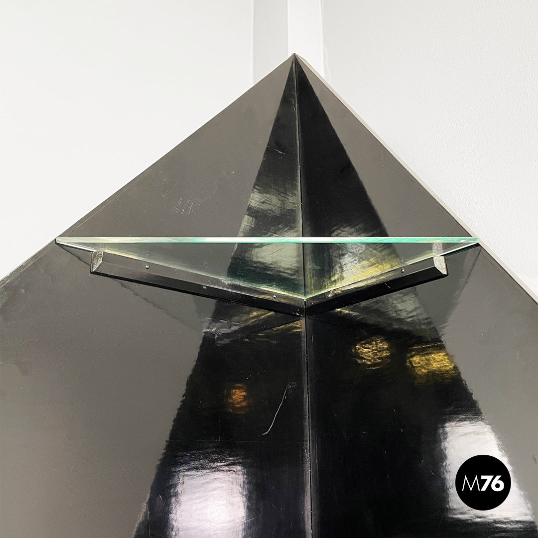 Wooden corner bar cabinet. The upper part has a triangular structure painted glossy black, with two triangular glass shelves. The lower part is made of walnut burl and includes two doors with clear glass handles and keys that open to reveal an internal compartment with a shelf in between. The lower doors feature a refined linear geometric decoration, consisting of thin inlaid strips that define rectangular frames. The base is black. There is a tubular metal handle on the front. The lower back is unfinished.