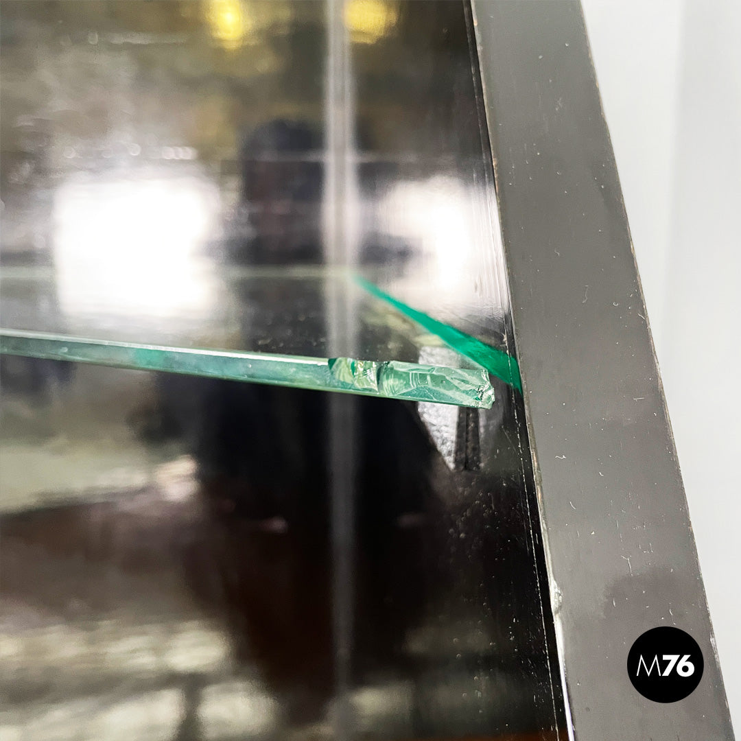 Vintage condition, signs of wear and tear, with various marks, scratches, and stains on the wood and metal. The glass on one shelf is chipped.
