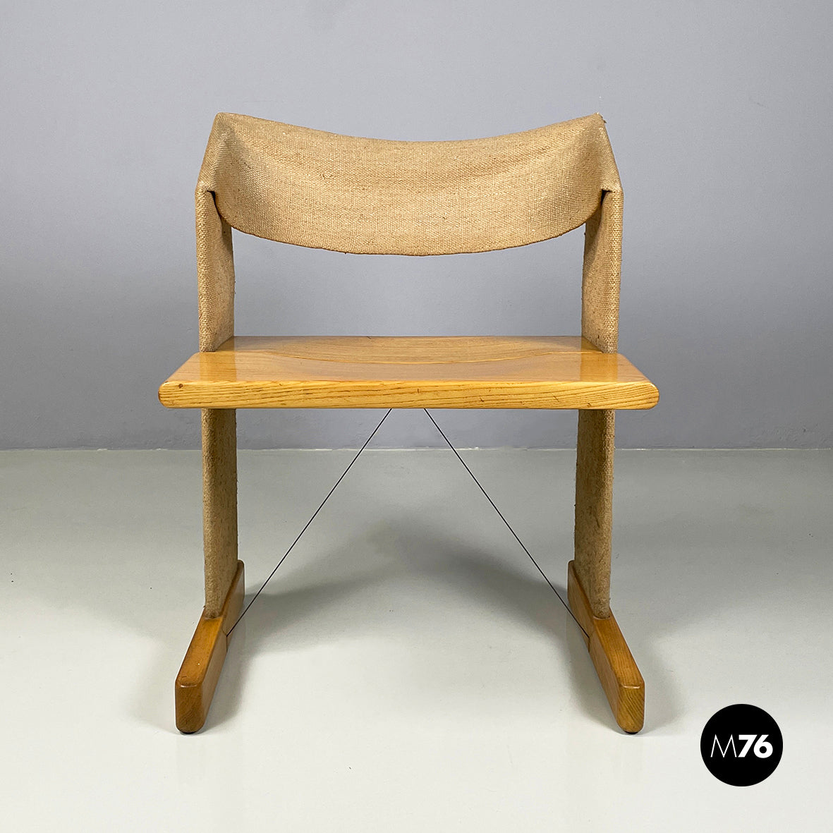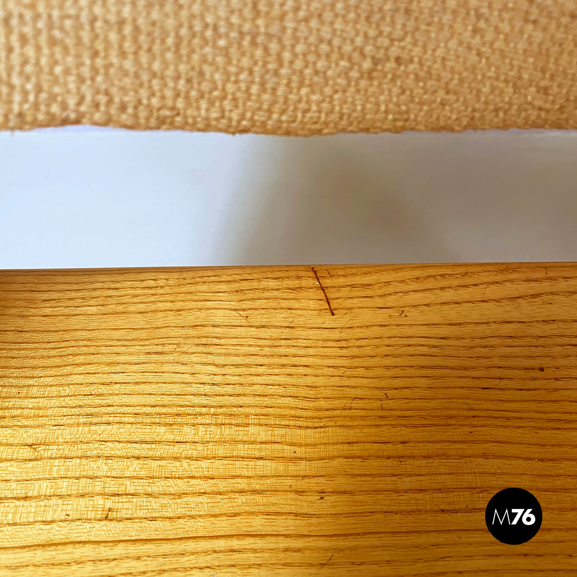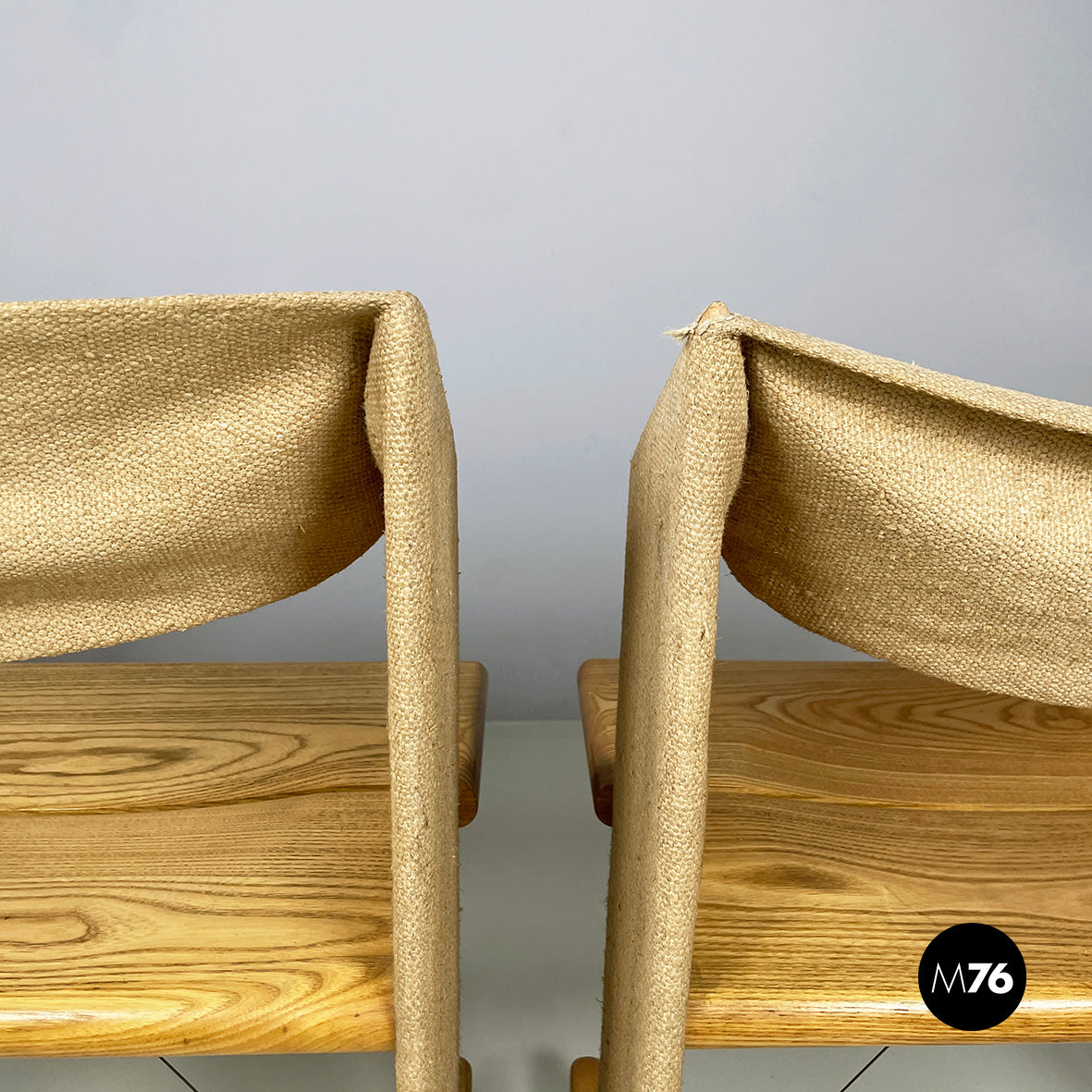 Set of 6 chairs mod. Canossa with rectangular seat with rounded corners in light wood. The beige fabric backrest has a wooden structure, which is not visible. The two legs are made of wood covered in fabric and have two metal support wires in the center. Oval feet in light wood.