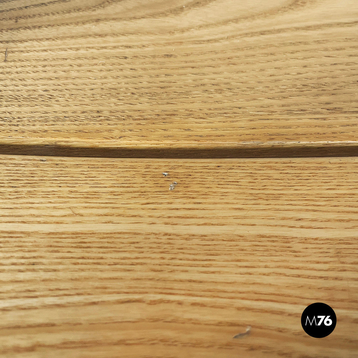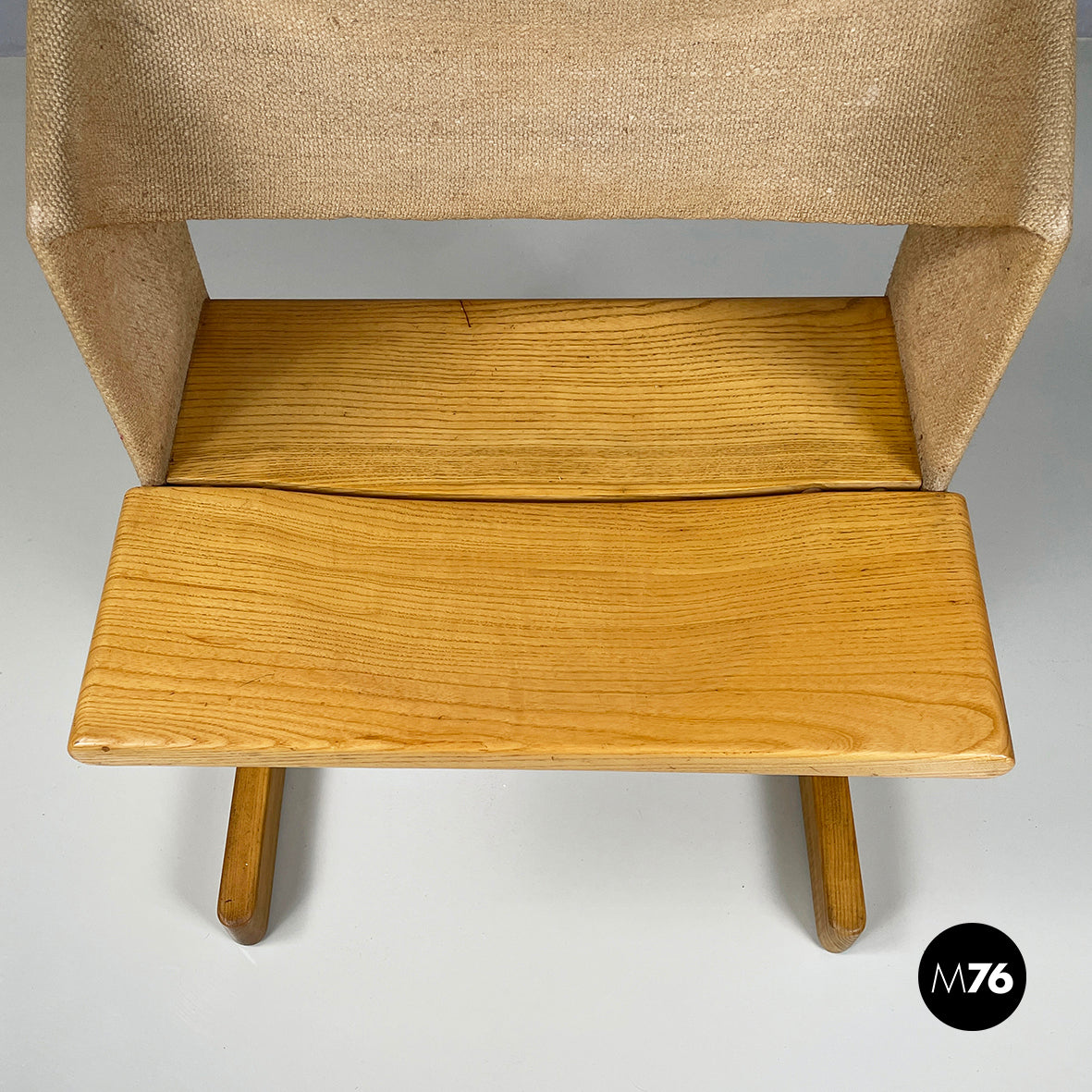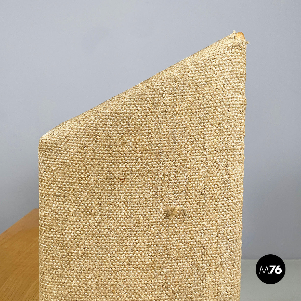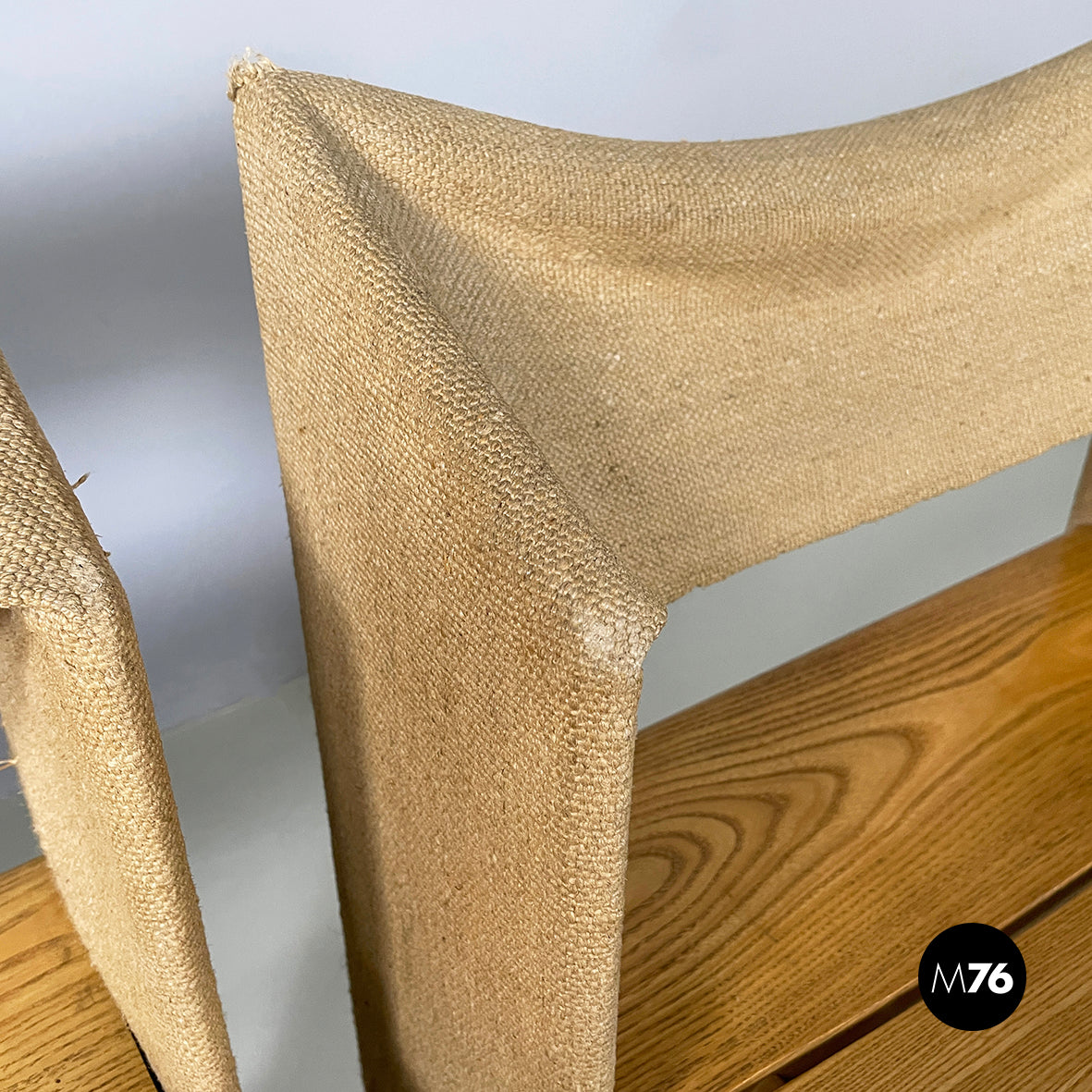 Set of 6 chairs mod. Canossa with rectangular seat with rounded corners in light wood. The beige fabric backrest has a wooden structure, which is not visible. The two legs are made of wood covered in fabric and have two metal support wires in the center. Oval feet in light wood.