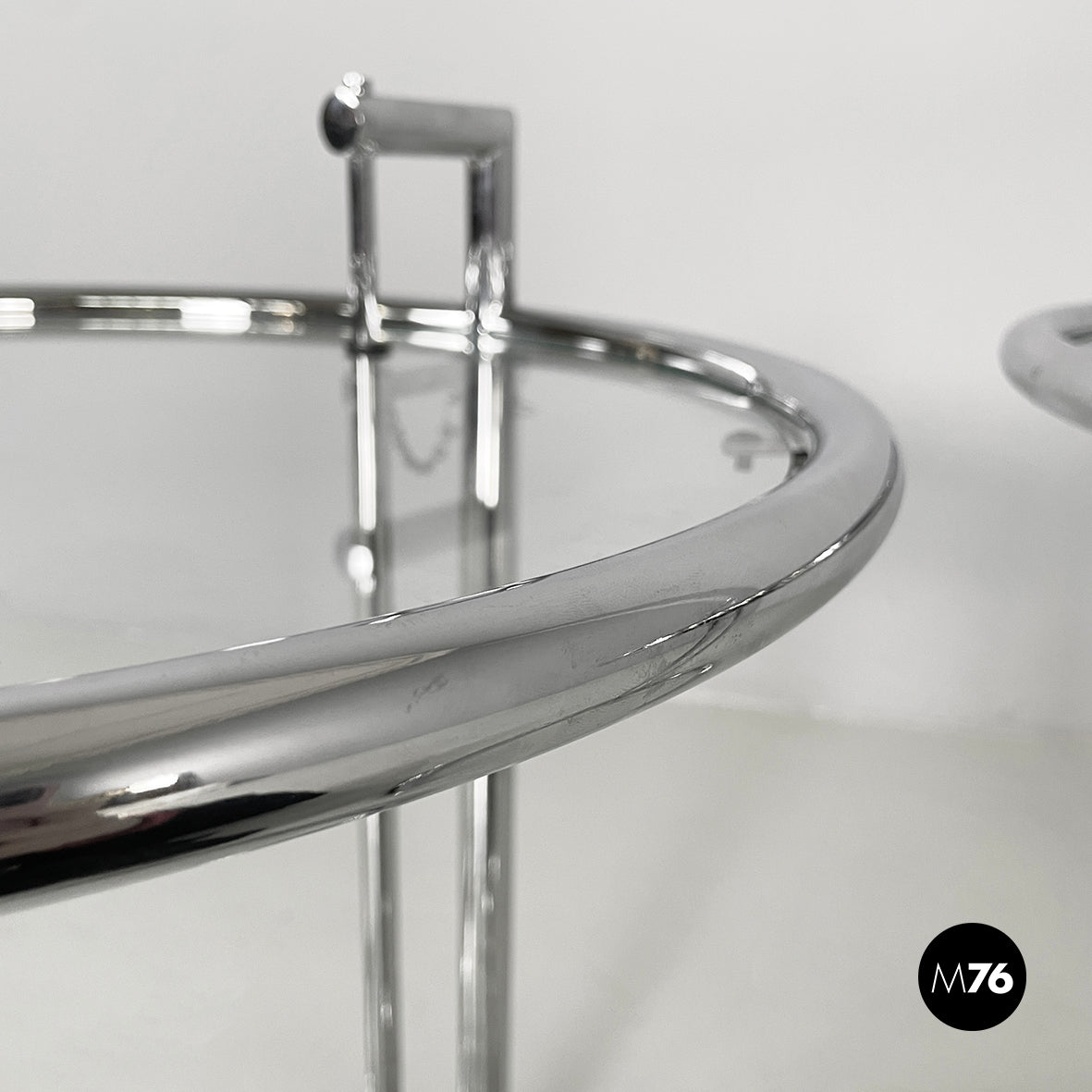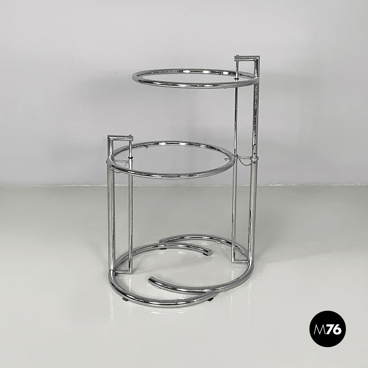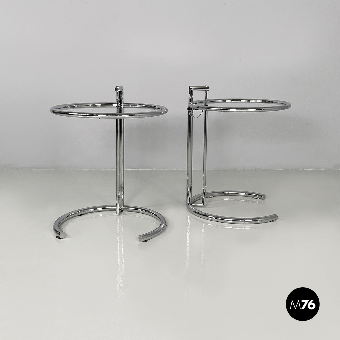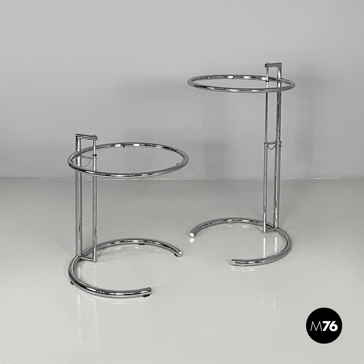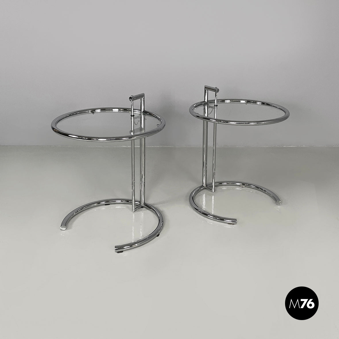 Pair of coffee tables with round glass top. The height of the top can be adjusted thanks to the extractable tubular steel structure.
