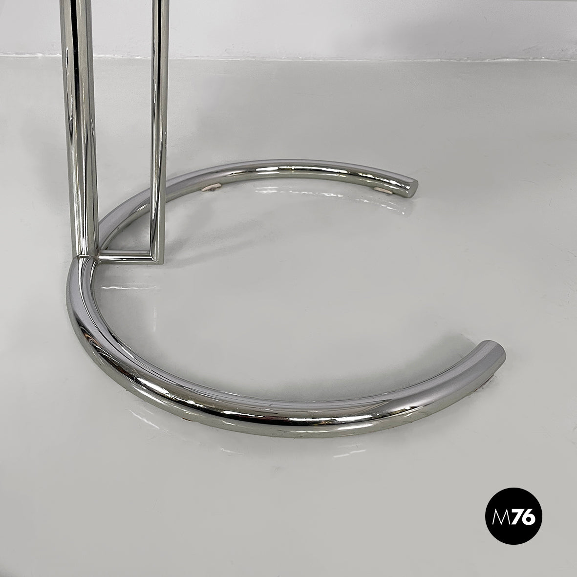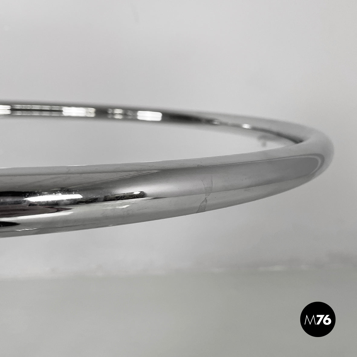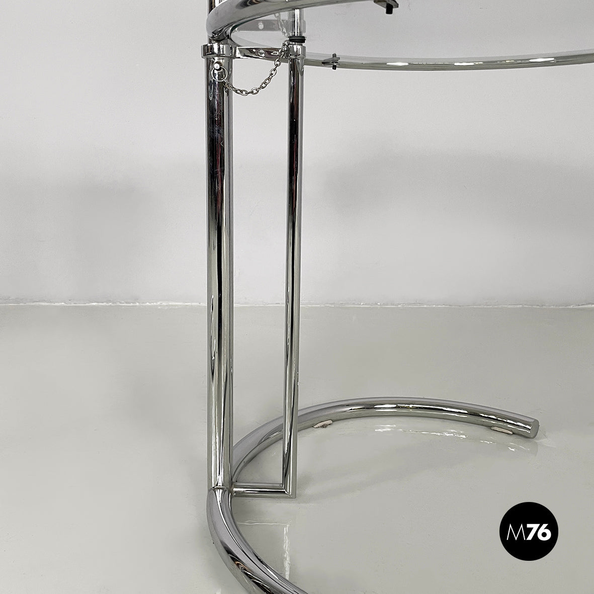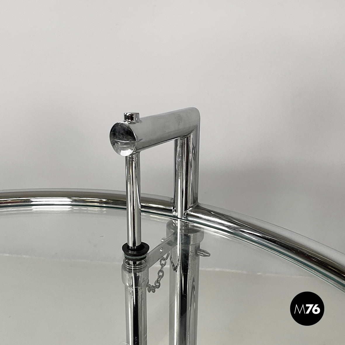 Pair of coffee tables with round glass top. The height of the top can be adjusted thanks to the extractable tubular steel structure.