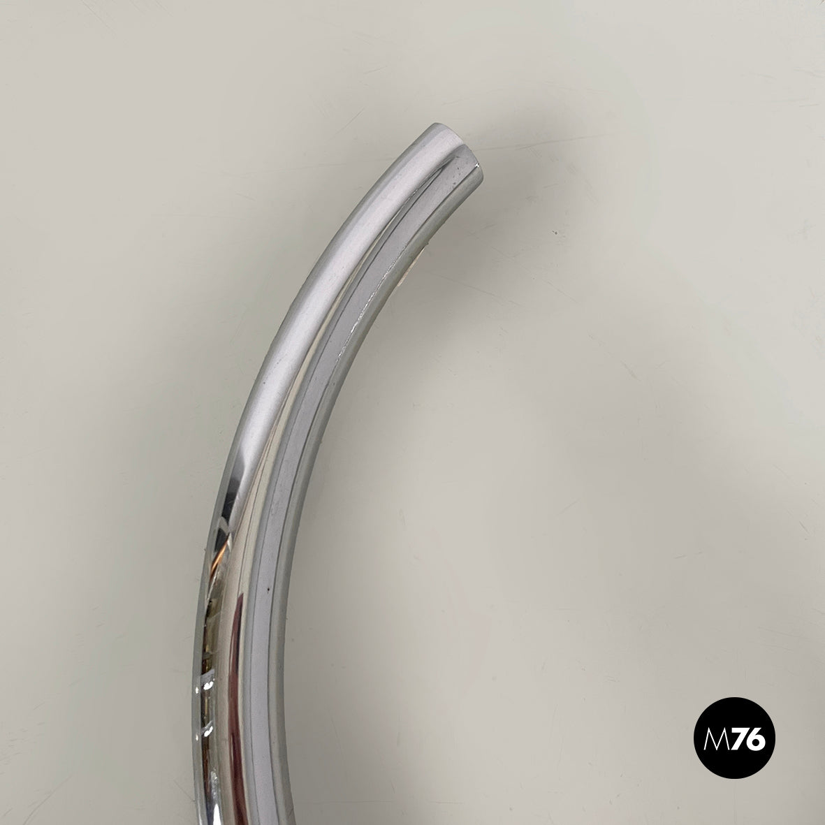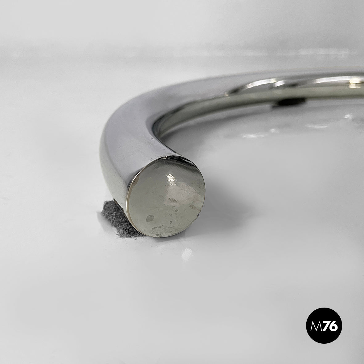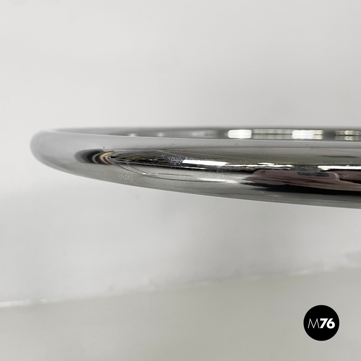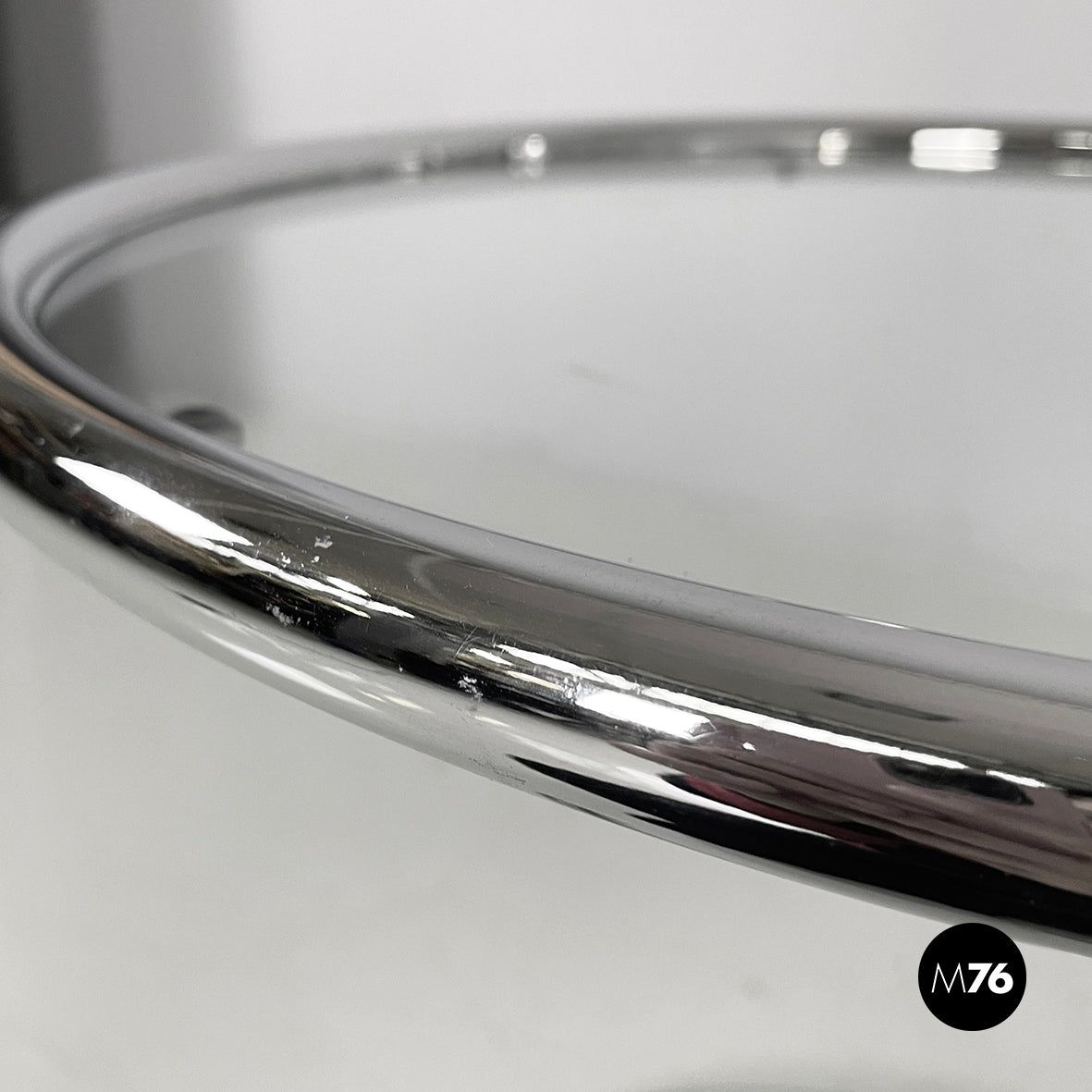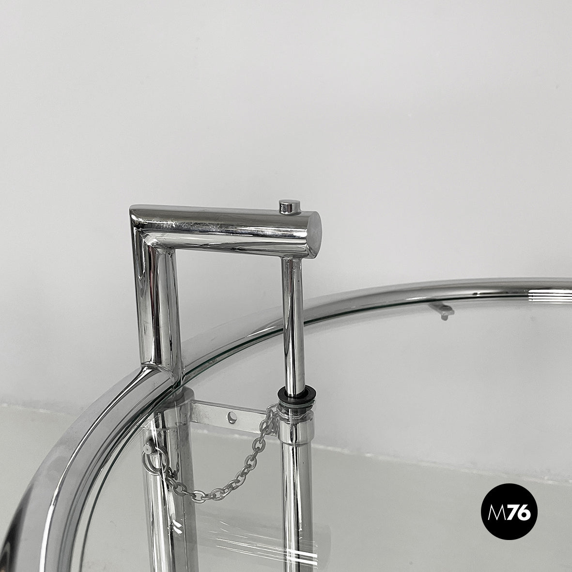 Pair of coffee tables with round glass top. The height of the top can be adjusted thanks to the extractable tubular steel structure.